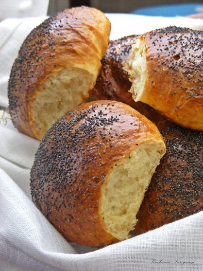 Smaczne, puszyste pięknie pachnące. Idealnie smakują z samym masełkiem. Ciasto wyrabia się bez żadnych problemów, jest elastyczne, fajnie się z nim pracuje. Jedyną wadą tych bułek jest to, ze trzeba je zjeść w ciągu 2 dni bo potem zaczynają się strasznie kruszyć ( chyba, że to wina dodania gęstego jogurtu zamiast bardziej płynnego ). Przepis z Tego bloga.
