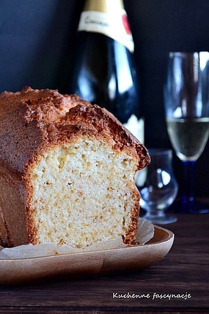 Od trzech lat przymierzałam się do tego ciasta. Zawsze po Sylwestrze zostaje tyle białego wina musującego, że ani wypić ani co z nim zrobić a ten przepis idealnie pozwala na spożytkowanie go. Ciasto w konsystencji i smaku przypomina typową babkę z tym, że czuć jakiś nietypowy dodatek. Mirabelka pisała, że nie czuć smaku ” szampana ” tylko białej czekolady chociaż w cieście nie ma jej ani grama. Ja natomiast w swoim cieście wyczuwam dodatek alkoholu. Być może uzależnione jest to od rodzaju wina musującego jakiego użyjecie. Ciasto jest łatwe i bezproblemowe. Przepis z bloga Mirabelkowy blog .