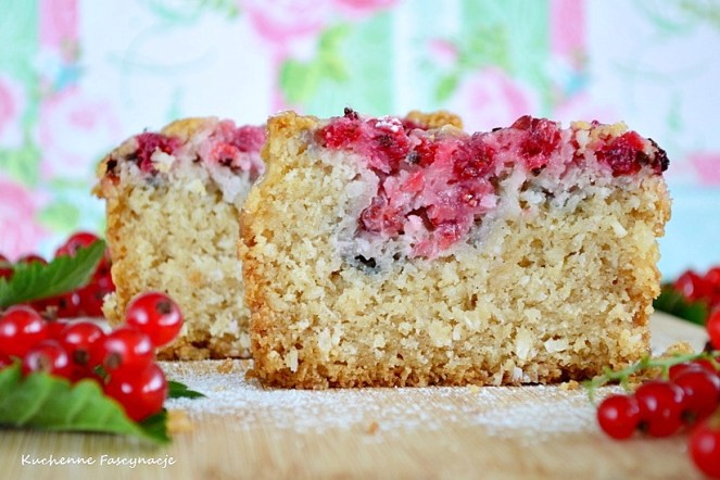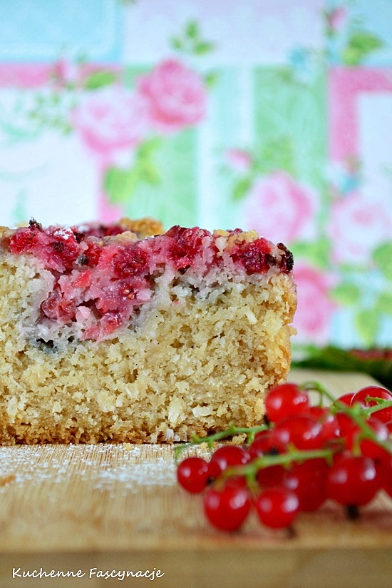 Wszystkie sypkie składniki mieszamy w jednej misce : mąkę, wiórki, cukier, proszek, sodę. W drugiej misce łączymy wszystkie mokre składniki : olej, ekstrakt i mleko. Do sypkich składników przelewamy mokre i szybko mieszamy. Ciasto przelewamy do formy o wymiarach 20×20 cm ( u mnie keksówka 26×16 cm ) wcześniej wyłożonej papierem do pieczenia. Wierzch ciasta posypujemy porzeczkami.