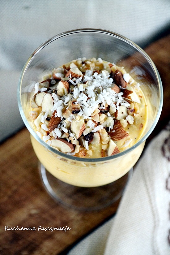 Jogurt, puree, przyprawy mieszamy razem aż całość dobrze się połączy. Przekładamy do szklanki. Wierzch posypujemy orzechami oraz wiórkami kokoowymi.