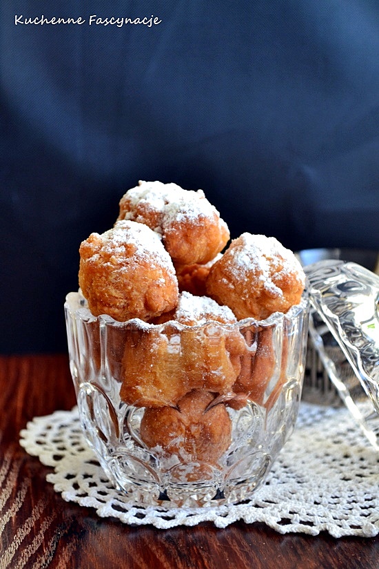 Z masy odrywamy ciasto wielkości pomidorka koktajlowego. Toczymy w dłoniach aż powstanie zgrabna kulka i wrzucamy na rozgrzany, głęboki olej. Smażymy ze wszystkich stron na złoty kolor. Wyjmujemy na papierowy ręcznik, następnie przekładamy do półmiska i oprószamy cukrem pudrem.