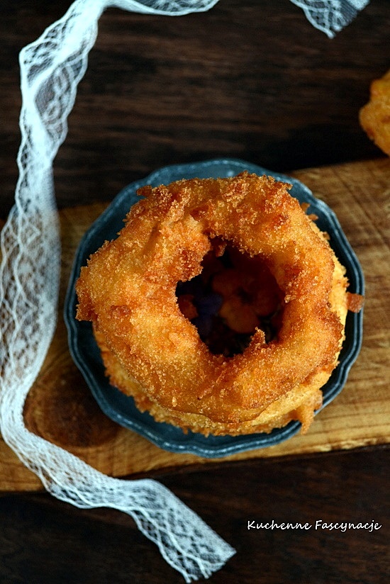 Każdy krążek cebulowy maczamy w cieście naleśnikowym strzepując jego nadmiar. Następnie obtaczamy delikatnie w bułce tartej i wrzucamy na rozgrzany, głęboki olej. Pamiętajcie aby olej nie był za mocno rozgrzany bo krążki nie wyjdą. Temperatura oleju powinna być ok 165 stopni chociaż ja tego nie sprawdzam, robię na wyczucie. Smażymy z obu stron na złoty kolor.