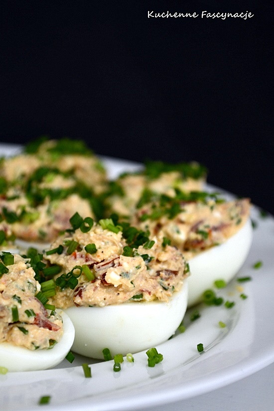 Jajka ugotować na twardo, ostudzić, obrać ze skorupki. Żółtka wyciągnąć do osobnej miski. Do żółtek dodajemy ser feta oraz majonez. Rozgniatamy wszystko za pomocą widelca. Dokładamy posiekane drobno suszone pomidory, szczypiorek. Solimy, pieprzymy. Całość dokładnie mieszamy i przekładamy z powrotem do białek. Na tym etapie skończyłam jajka i były dla nas wystarczające bez dokładania sosu.
