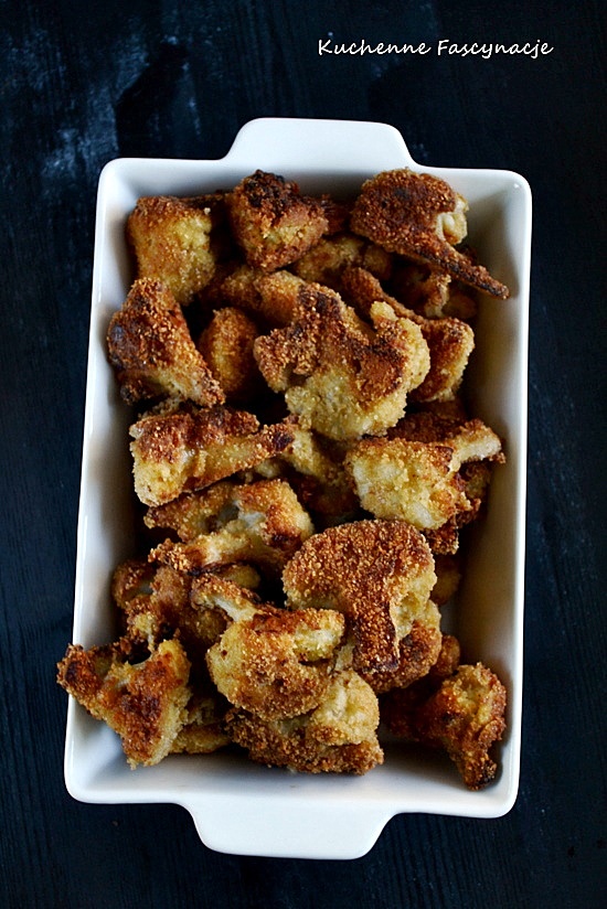 Każdą różyczkę kalafiora tniemy na pół po czym maczamy w rozbełtanym jajku oraz obtaczamy w bułce tartej. Smażymy na niewielkiej ilości rozgrzanego oleju na złoto z każdej strony. Usmażonego kalafiora odkładamy na chwilę na ręcznik papierowy aby pozbyć się nadmiaru tłuszczu.