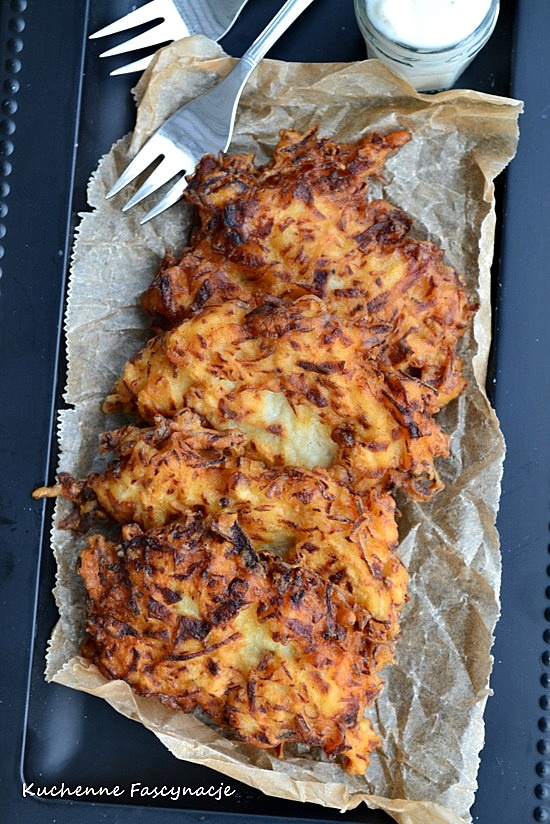Na dużej patelni rozgrzewamy dość sporą ilość oleju. Smażymy placuszki na średnim ogniu na złoty kolor z obu stron. Po zdjęciu z patelni odcedzamy na ręczniku papierowym.