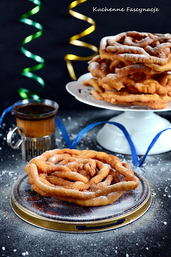 Kiedy olej będzie rozgrzany wkładamy puszkę lub w jednej ręce trzymamy chochlę/łyżkę cedzakową zanurzoną w oleju a drugą ręką wyciskamy okrężnymi ruchami porcję ciasta. Nie za dużo. Około 4 -5 okręgów. Kiedy ciasto zacznie odchodzić od chochli wyciągamy ją ( tak samo puszkę – UWAGA będzie gorąca ) i smażymy na złoty kolor z obu stron. Usmażony chrust wyciągamy na ręcznik papierowy. Postępujemy tak samo do wyczerpania ciasta.