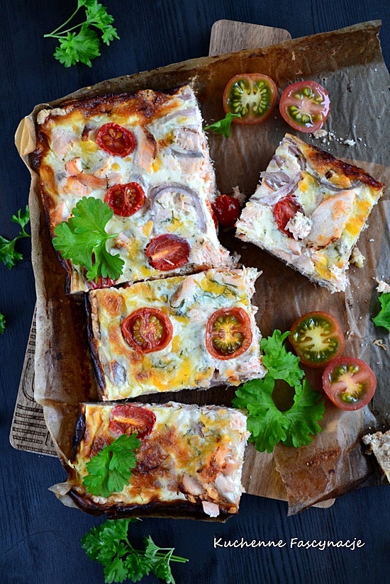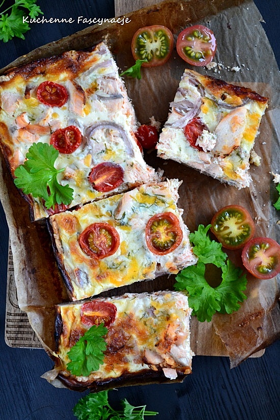 Osobno w misce mieszamy creme fraiche, mleko, jajka, koperek. Całość doprawiamy pieprzem. Masę wylewamy na łososia. Na wierzchu układamy przecięte na pół pomidorki koktajlowe delikatnie wciskając je w nadzienie.