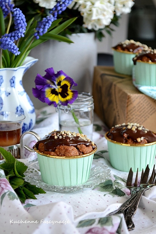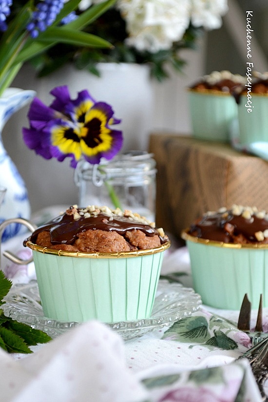 Babeczki o smaku orzechów laskowych przełamanym czekoladą. Dodatkowo okraszone polewą czekoladową i szczyptą orzechów laskowych co wzmacnia i uzupełnia smak babeczek dlatego nie polecam rezygnowania z tego wykończenia. Przepis z bloga Moje Wypieki.