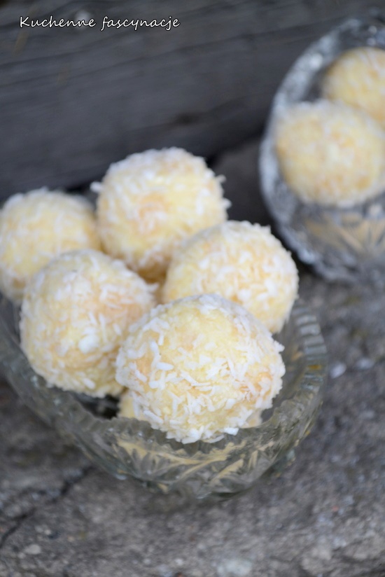Po pół godzinie wyjmujemy masę z lodówki ( można trzymać dłużej do momentu kiedy mamy czas na lepienie ) ,formujemy kulki i wkładamy migdał do środka, następnie obtaczamy w wiórkach kokosowych.