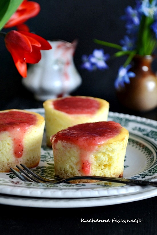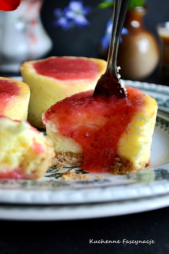 Serniczki powstały z przepisu na placuszki serowe z mlekiem w proszku, które będą prezentowane w następnym poście. Masy serowej wyszło tak dużo, ze połowę przeznaczyłam na serniczki bo nie miałam czasu stać i smażyć ich tak długo. Serniczki są bardzo delikatne, puszyste a ciastko digestive na spodzie dodaje im dodatkowego smaku i struktury. Brakowało mi spoiwa, które doda większego charakteru więc postawiłam na mus z truskawek i to był świetny wybór. Mus z truskawek nadaje świeżości i kolejny stopień budujący smak. Przepis na masę serową pochodzi z bloga I love bake .