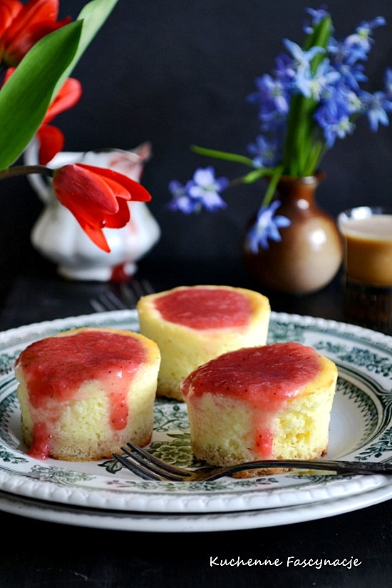 Wystudzone serniczki polewamy zmiksowanymi na mus truskawkami. Jeśli truskawki są mało słodkie należy je dosłodzić ulubionym słodzikiem.