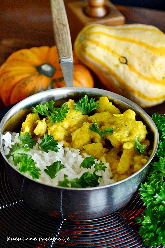 Piersi z kurczaka myjemy, osuszamy. Tniemy w niewielką kostkę. Doprawiamy solą, pieprzem, przeciśniętym przez praskę czosnkiem, kurkumą, ostrą papryką, curry. Dodajemy 1 łyżkę oleju. Mieszamy. Odstawiamy.