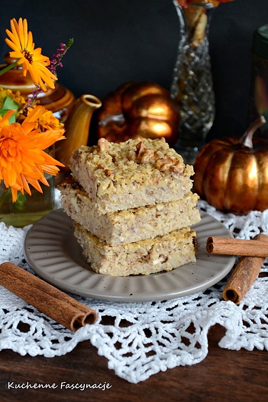 Wielokrotnie wspominałam przy przepisach z dynią, że nie lubię jej intensywnego smaku w wypiekach i potrawach. Dlatego tutaj ograniczyłam jej ilość o połowę a resztę zastąpiłam jogurtem. Owsianka nie jest sucha jak to się często zdarza. Ta jest miękka, wilgotna z delikatnym korzennym smakiem i chrupiącymi orzechami włoskimi. Lubię ją jeść na śniadanie w towarzystwie jogurtu naturalnego. Przepis z mollyshomeguide.com .