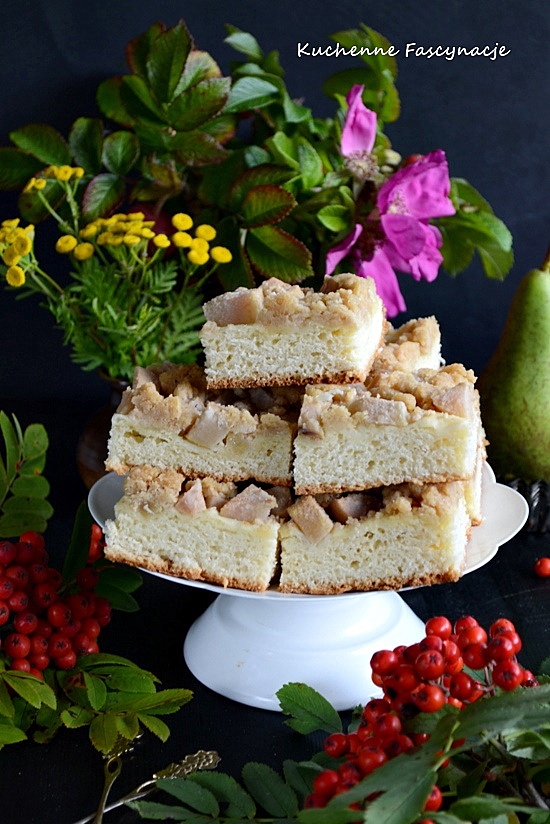 Bardzo smaczna tarta. Każdy element wpływa tutaj na smak. Orzechowy spód, krem budyniowy z serkiem mascarpone a na samym wierzchu przepyszne gruszki al dente gotowane wcześniej w cydrze ( w oryginale powinno być białe wino ). Skuszą się nawet Ci, którzy nie przepadają za ciastami z kremem. Przepis z bloga Mała cukierenka .