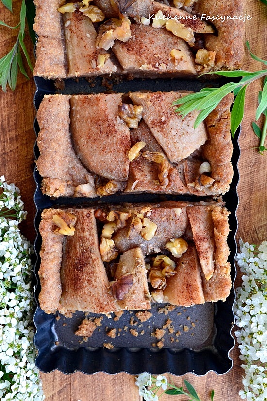 Kruche pełnoziarniste ciasto wypakowane soczystymi gruszkami z chrupkimi orzechami i nutą cynamonu. Szybko, łatwo i smacznie. Przepis z TĄD.