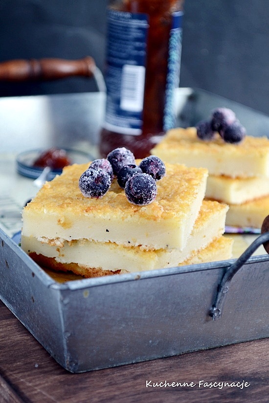 Masę przelewamy na wyłożoną papierem do pieczenia ( łącznie z bokami ) dużą czarną blachę w którą wyposażony jest każdy piekarnik. Równamy wierzch. Pieczemy w 225 stopniach C przez 30 minut.