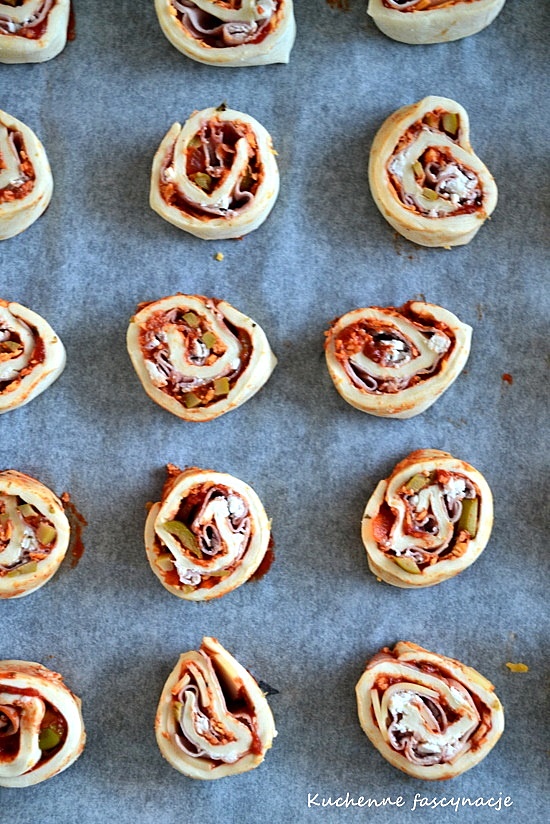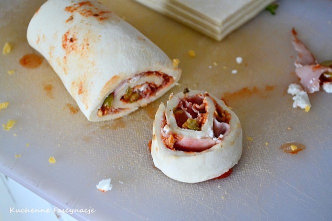 Ciasto francuskie zwijamy w dość ciasny rulon, który tniemy na ok 1 cm krążki.