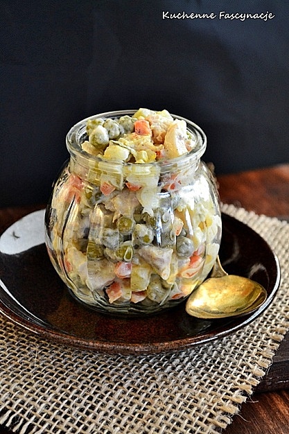 Świeże warzywa siekamy w niewielką kostkę. Ogórka kiszonego nie obieramy ze skórki, siekamy również w kostkę. Kurczaka rozdrobnić na mniejsze kawałki. Pieczarki posiekać w plasterki.