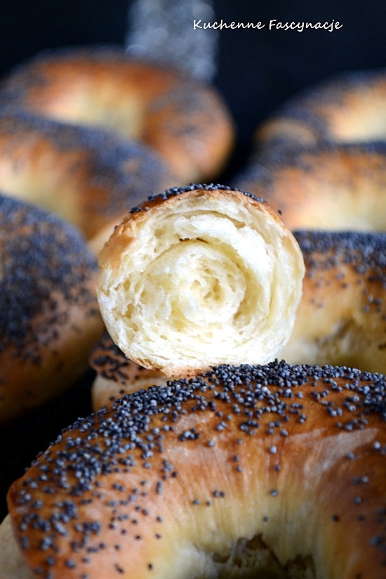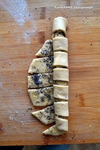 Wyrośnięte ciasto przekładamy na stolnicę podsypaną mąką. Wałkujemy na prostokąt o wymiarach ok 40 x 60 cm. Na całej powierzchni rozsmarowujemy masę makową. Następnie ciasto z nadzieniem zwijamy ciasno w roladę/rulon wzdłuż dłuższego boku. Następnie roladę tniemy na 4 cm kawałki. Następnie każdy na środek każdego kawałka należy położyć np. cienki trzonek łyżki drewnianej i docisnąć do samego spodu.