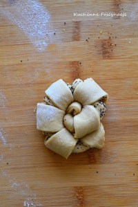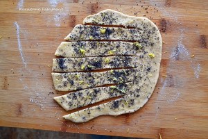 Wyrośnięte ciasto chwilę wyrabiamy. Dzielimy na 12 równych części. Każdą część rozwałkowujemy na cienki placuszek. Smarujemy masłem, posypujemy cukrem, ścieramy skórkę z 1/4 cytryny oraz posypujemy makiem. Placek kroimy w paski tak aby jeden bok pozostał w całości.