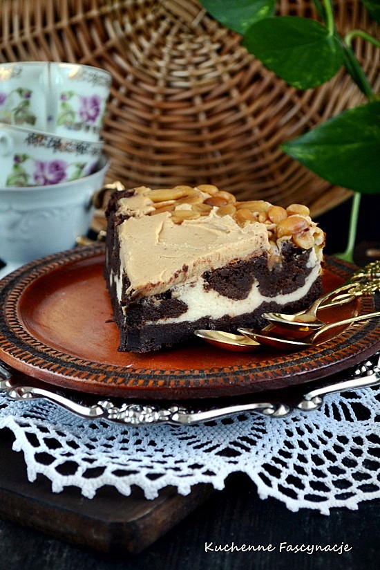 Kiedy nie wiecie na co zdecydować się…sernik czy brownie upieczcie dwa w jednym. Pyszny serniczek, który może być w całości wegański. Słodkość idealnie wywarzona. Wierzch pokrywa masa z masła orzechowego a także solone orzeszki ziemnie, które dodają dodatkowy smak i charakter całości. Przepis z bloga Bianca Zapatka .