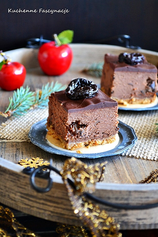 Po schłodzeniu polewamy polewą czekoladową i dekorujemy dodatkowymi suszonymi śliwkami.