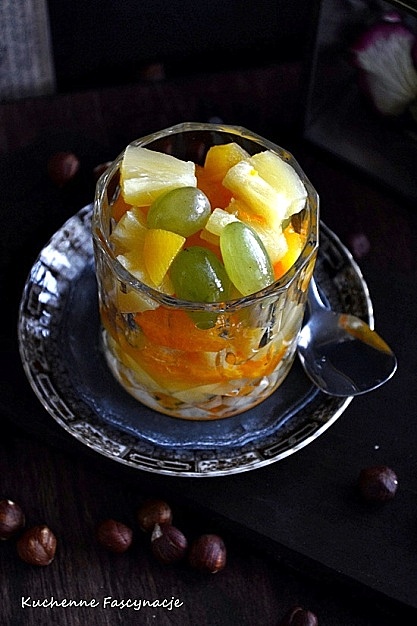 W tym czasie w 750 m gorącej wody rozpuszczamy 2 galaretki krystaliczne lub o innym smaku. Studzimy ale galaretka powinna pozostać płynna.